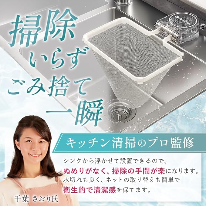 【三角コーナーいらず】 もうシンクに三角コーナーは不要。生ゴミは水切りネットで浮かせて処理するから、ぬめりも臭いも激減。掃除の手間を省き、清潔なキッチンをキープできます。設置面に接しない空中構造で、衛生面も◎。家事のストレスを減らしたい方に最適です。