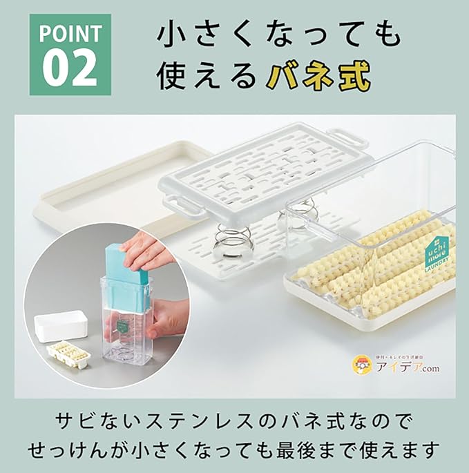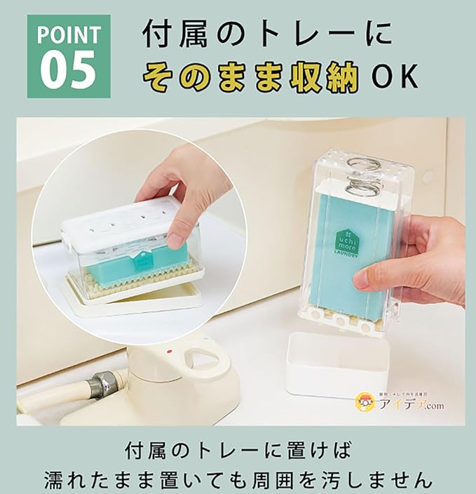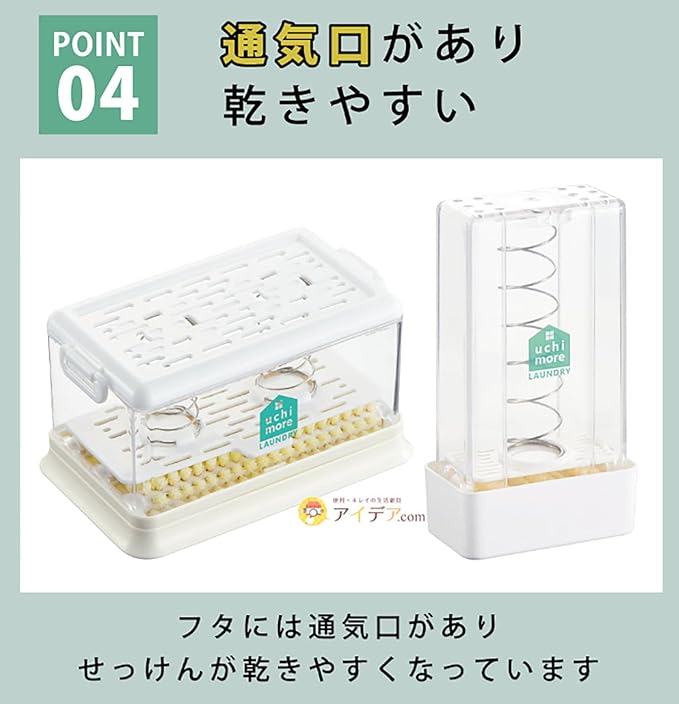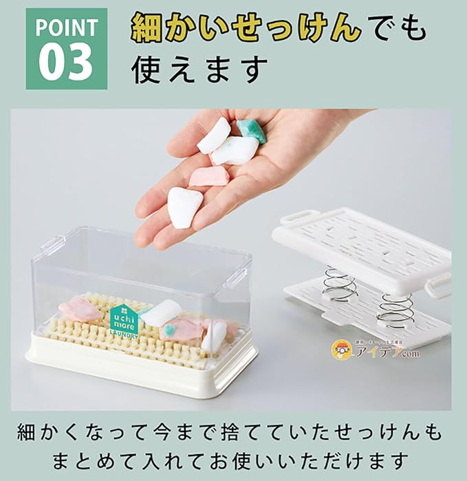 ローラーブラシでしっかり泡立ちます。 通気口付のフタなので、乾きやすくなっています。 これ1つでせっけん収納から汚れ落としまででき、使用後はそのまま置いて収納可能です。 細かくなったせっけんも使用可能です。 面倒な部分汚れのこすり洗いに便利。 対応せっけんサイズ:105 65 28mm 製品サイズ:8 4.5 14.2cm 重量:114.1g 材質:ケース・トレー:ポリプロピレン、ポリスチレン ブラシ:ポリプロピレン バネ:ステンレス