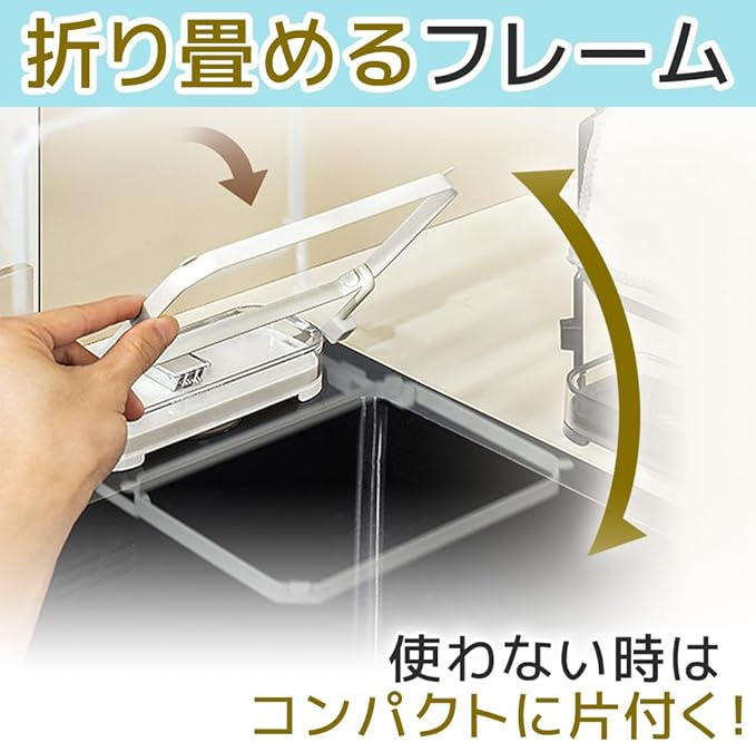 フレームには水を吸って重くなった生ゴミを入れても歪まないよう、頑丈な素材を採用しました。フレームは上に折り畳めるので、未使用時は邪魔にならないだけでなく布巾掛けとしてもお使いいただけます。
