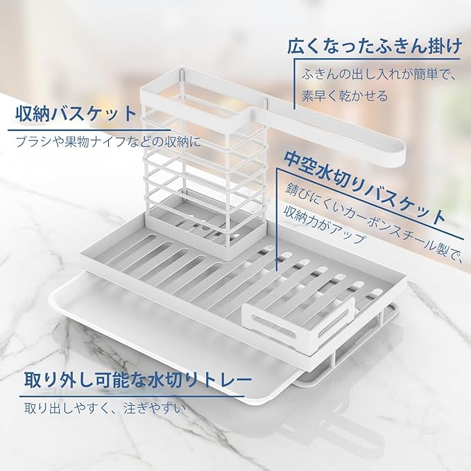 スポンジホルダー スポンジ置き 柄付きブラシ&ふきん 収納可能 スポンジラック キッチン用 スポンジ洗剤置き 防錆 洗剤ホルダー 炭素鋼製 多機能 大容量 水切り スポンジ・たわし入れ 台所 洗面所 (ホワイト)