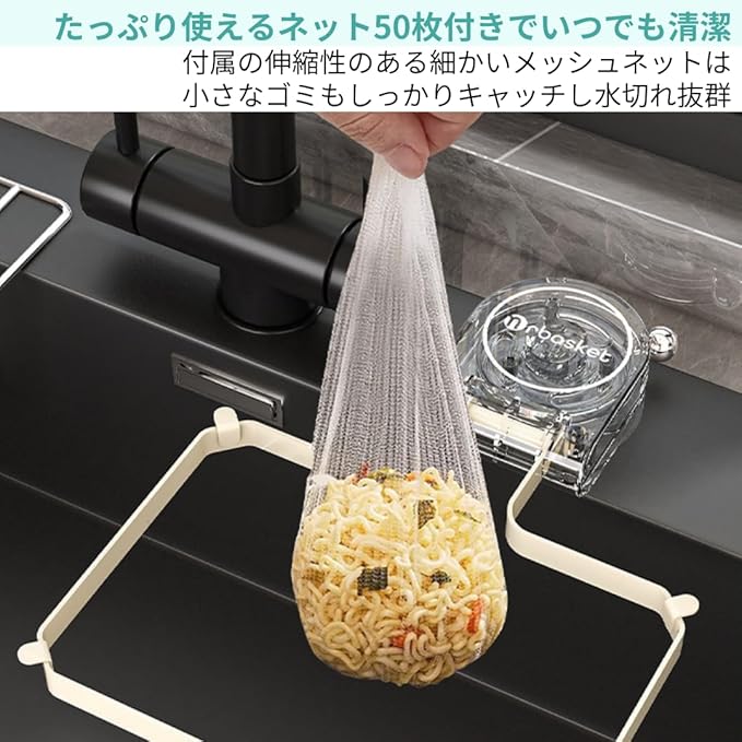【強力吸盤でしっかり固定】吸盤式でシンクに簡単取り付け。強力吸盤でしっかりと固定されるので、ずれ落ちる心配がありません。取り外しも簡単で、設置場所を変えたいときも手軽に移動できます。賃貸でも安心してお使いいただけます。付属の伸縮性のある細かいメッシュネットは、小さなゴミもしっかりキャッチし水切れ抜群。ネットは50枚もセットになっているので、いつでも清潔な状態をキープできます。