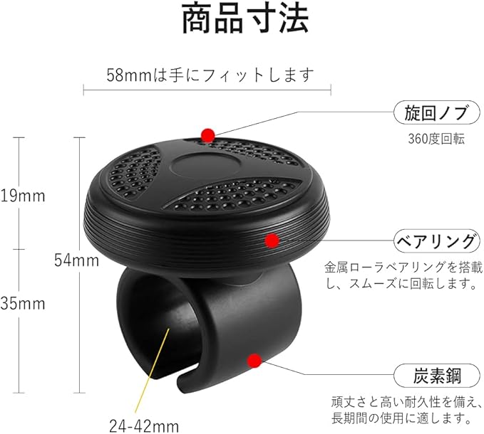 【製品仕様】素材:シリコーン+炭素鋼、カラー:ブラック、グリップ部分サイズ:直径58mm、 適合サイズ:ハンドル直径Φ24mm-42mm。