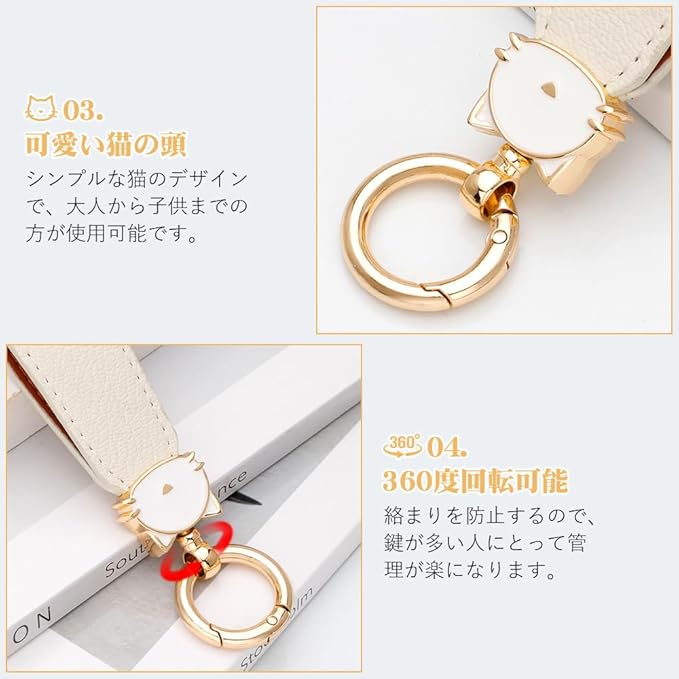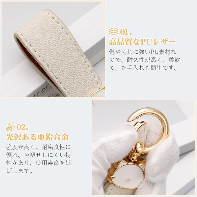 高品質なPU素材・光沢感ある金属:程よい厚さのPUレザーストラップ(厚さ約6mm)と光沢のある金属を組み合わせた可愛い猫の頭型のキーホルダーで、落ち着きながらも主張のあるデザインです。柔らかく取り付けも簡単です。シンプルなデザインなので、どんなカバンにも合わせやすいです。