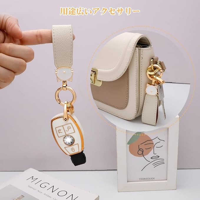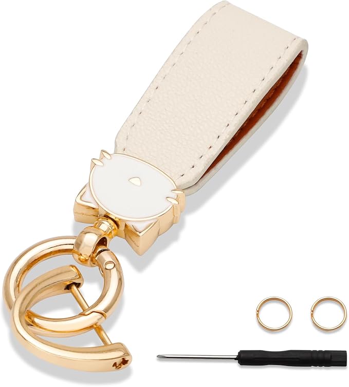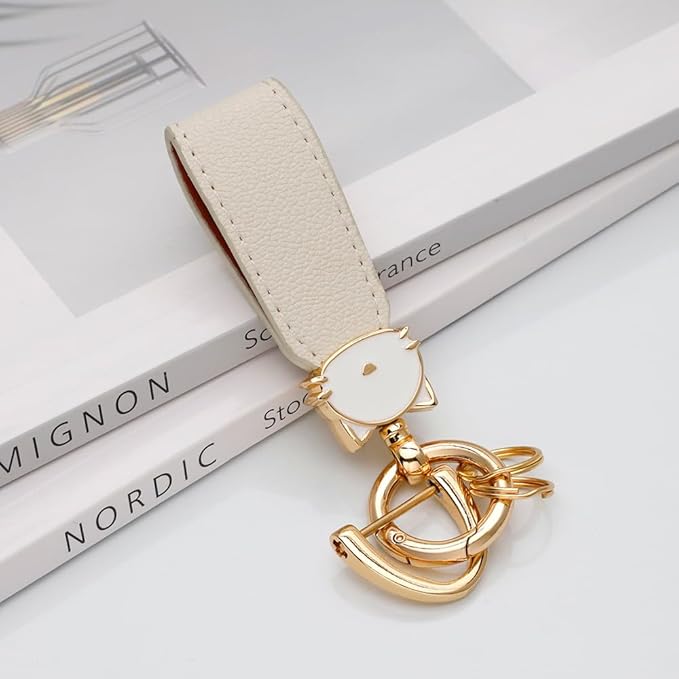 [MAZERO] キーホルダー 可愛い キーチェーン キーリング PUレザー 紛失防止 車用 スマートキー おしゃれ シンプル 猫 汎用 自転車 バイク 鍵 カラビナ付き ストラップ レディース 人気 ベージュ