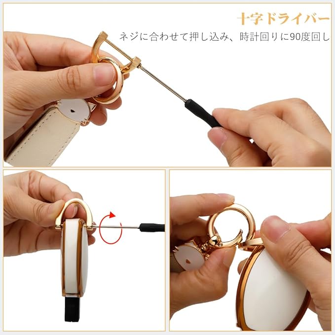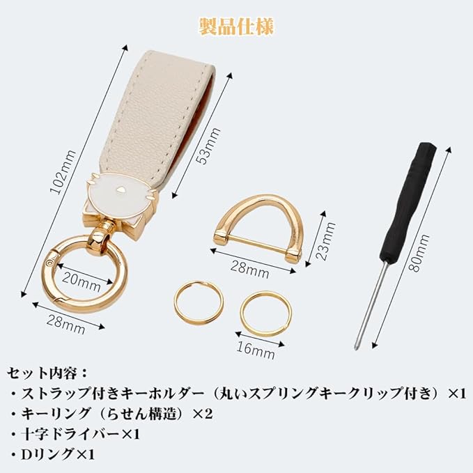 商品セット内容:キーホルダー、Dリング、キーリング2個、プラスドライバー、色んなシーン大活躍です。 Dリングには車のスマートキーやバイクのキーなどを掛けることができ、小さなキーリングには小さいなおもちゃなどを掛けることができます。年齢問わず使えて、おしゃれで可愛くて、大人から子供まで気軽に使えます。