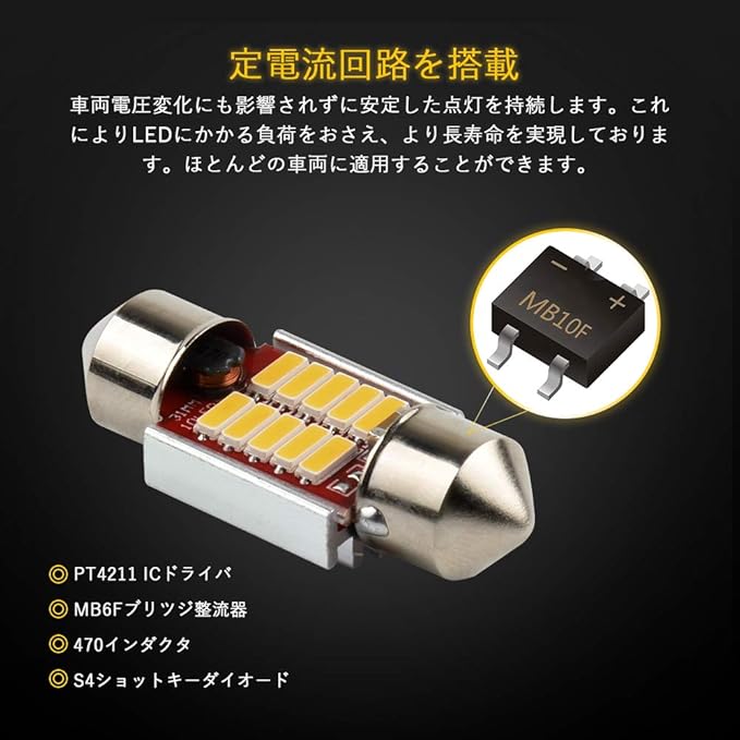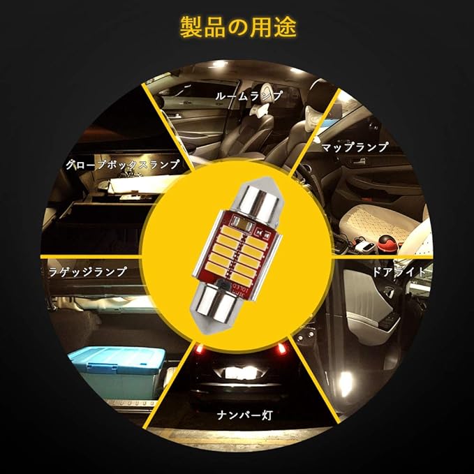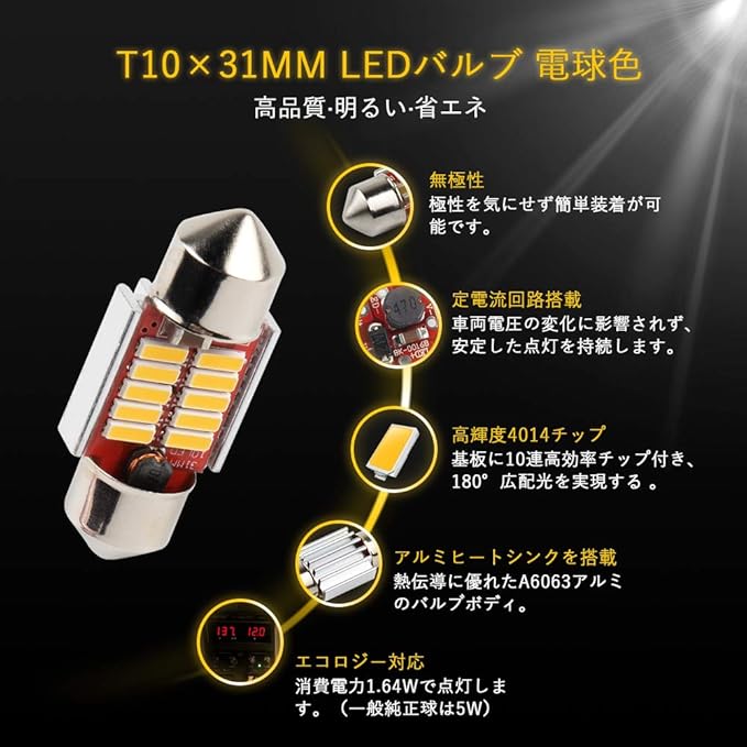 【取り付け簡単】純正球T10x31mmとほぼ同じサイズなので、大部分車種の装着スペースが心配なし。無極性ですので、ルームランプ用の純正球と簡単に交換でき、原箇所のまま差し込むだけで完了。◎バルブ規格:T10 31mm ◎カラー:電球色(ウォームホワイト) ◎対応電圧:DC12V ◎電流:137mA 10mA ◎消費電力:1.64W ◎極性:極性無し ◎サイズ:約31mm 12mm 差込み部幅約9mm ◎用途:ルームランプ マップランプ ラゲッジランプ ナンバー灯 ドアライト グローブボックスランプ ◎保証期間:お買い上げ日より100日間保証。【※ご注意:一部の商品の包装には「純ホワイト」と書かれていますが、実際のLEDバルブの発光色は電球色です。安心して使ってください。】
