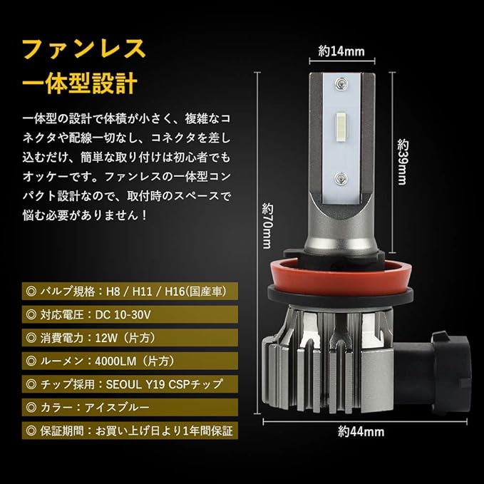 【商品仕様&保証サービス】バルブ規格:H8 / H11 / H16(国産車)、用途:フォグランプ、カラー:アイスブルー、チップ採用:SEOUL Y19 CSPチップ、対応電圧:DC 10-30V、消費電力:12W(片方)、ルーメン:4000LM(片方)。【※ 安心の一年保証:弊店はご注文日より1年品質保証ありますので、万が一商品が問題あるなら、ご遠慮なく「店名」-「質問する」の手順でクリックして連絡ください。24時間以内返答で、新品交換や返金などの解決策がご提供頂します。】