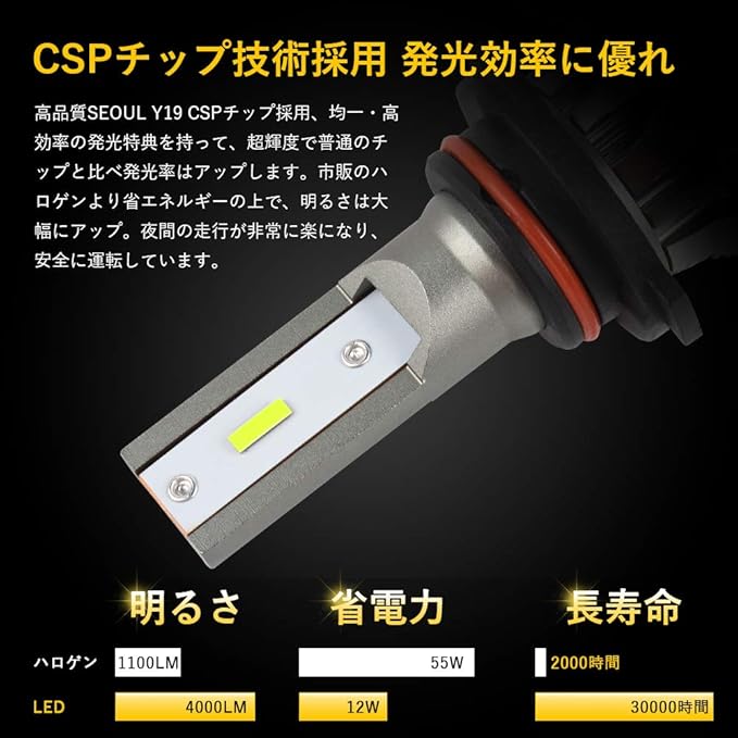 【発光効率に優れ】高品質SEOUL Y19 CSPチップを採用し、より効率のいい発光となりました。ハロゲンバルブの配光特性を更に追及。他車へ幻惑を与えない正確な配光を生み出し、広範囲な配光で路面を確実に照らす高い路面照射精度を実現しています。市販のハロゲンより省エネルギーの上で、明るさは大幅にアップ。