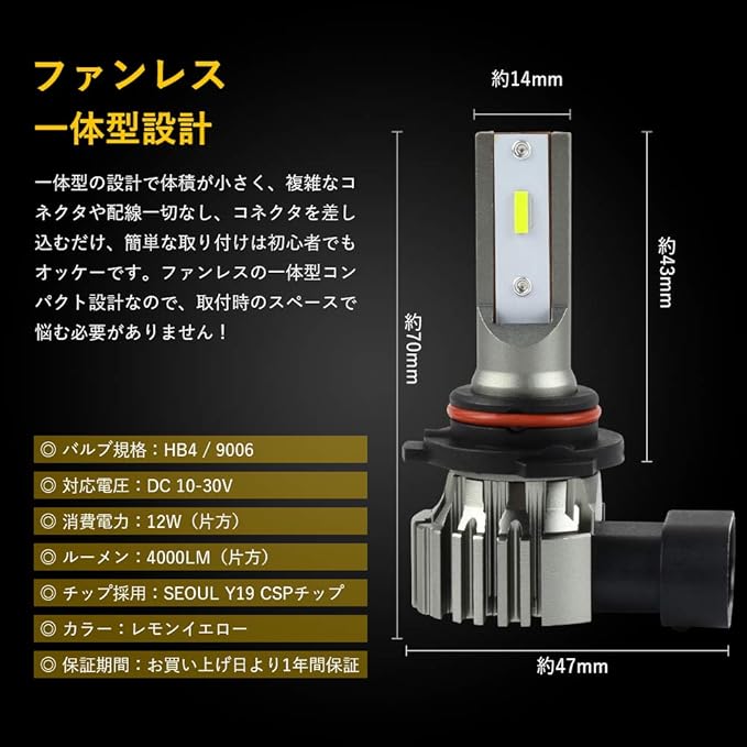 【商品仕様&保証サービス】バルブ規格:HB4 9006、用途:フォグランプ、カラー:レモンイエロー、チップ採用:SEOUL Y19 CSPチップ、対応電圧:DC 10-30V、消費電力:12W(片方)、ルーメン:4000LM(片方)。【※ 安心の一年保証:弊店はご注文日より1年品質保証ありますので、万が一商品が問題あるなら、ご遠慮なく「店名」-「質問する」の手順でクリックして連絡ください。24時間以内返答で、新品交換や返金などの解決策がご提供頂します。】