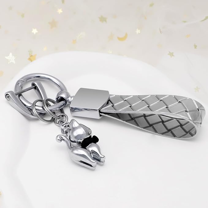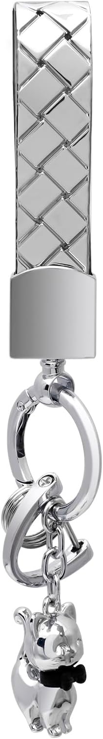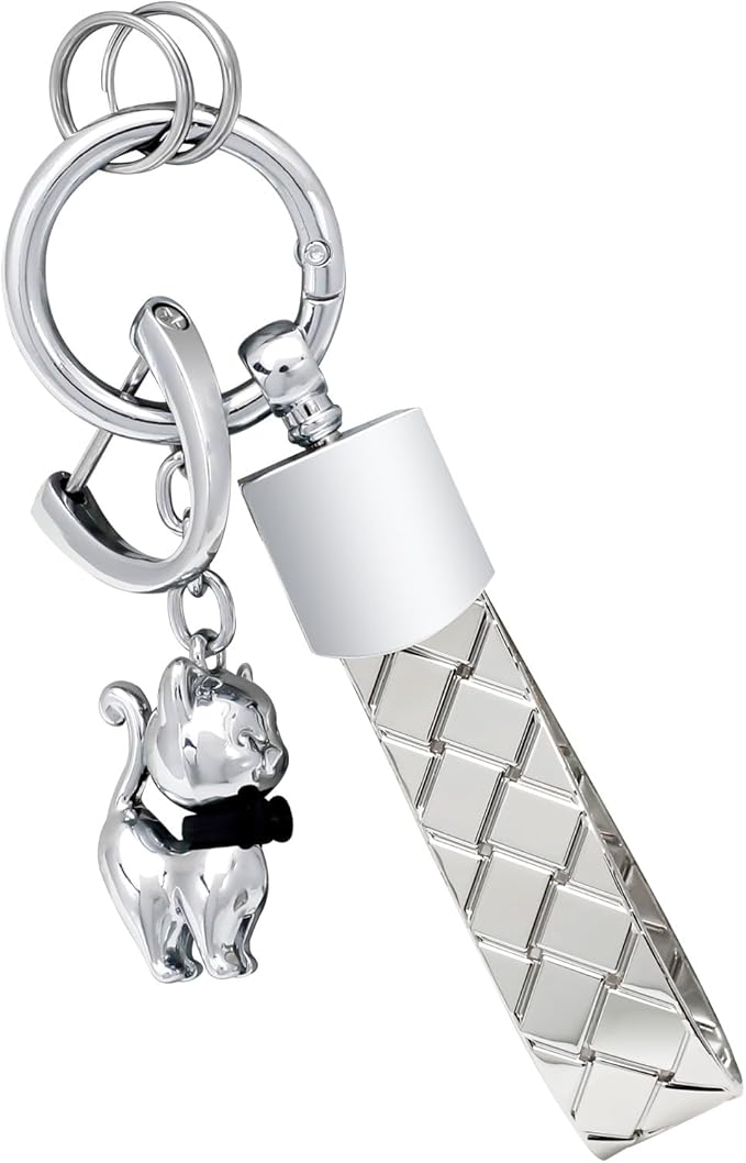 【かわいい猫のキーホルダー】チェーンと猫の立体チャームはそれぞれ独立したキーホルダーになっており、一緒にも、別々にもお使いいただけます。猫のチャームは亜鉛合金製で、光沢のあるシルバーに黒いリボンを合わせた落ち着いたデザインです。シンプルな菱形の柄のキーチェーンと組み合わせることで、鍵をまとめやすく、使いやすいセットになっています。