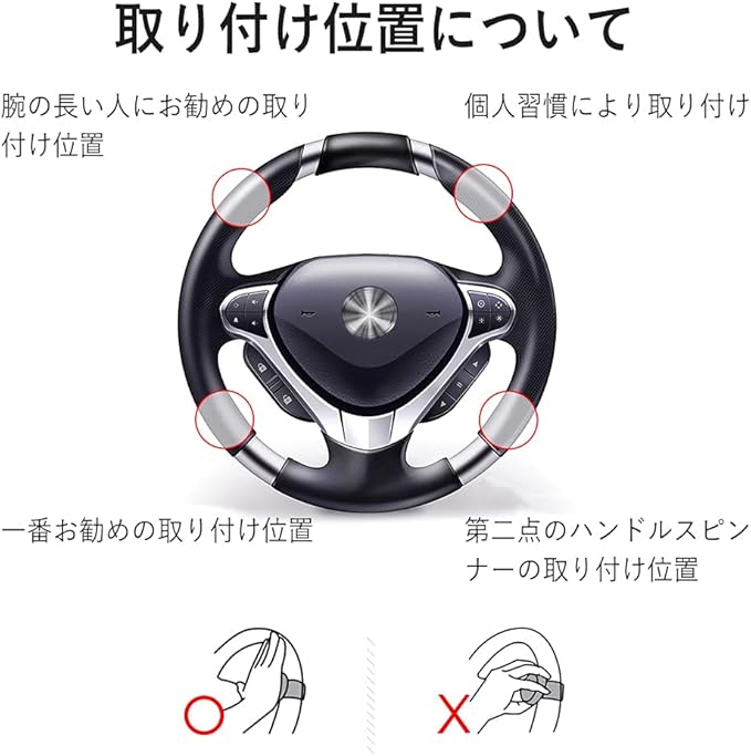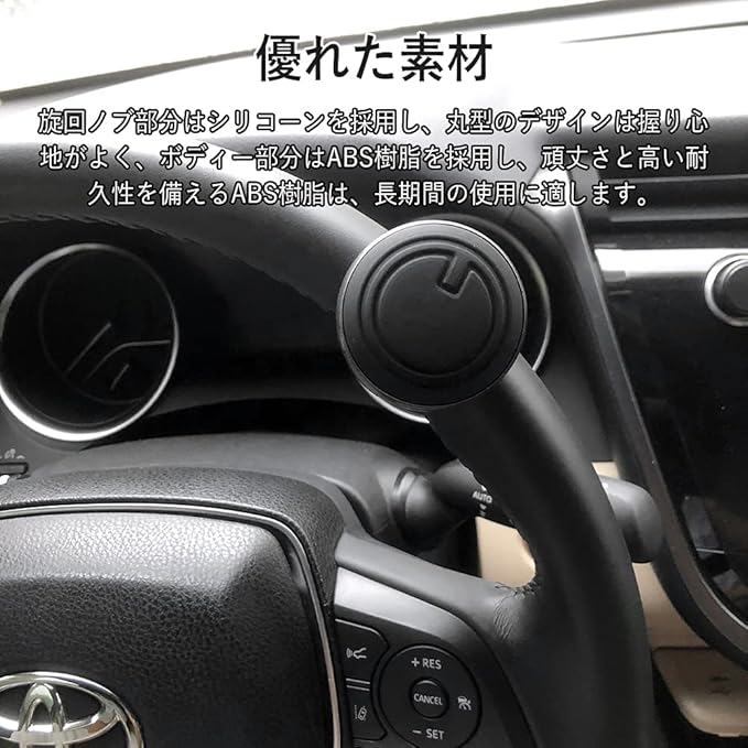 【広い用途】ユニバーサル設計で、大部分の自動車ハンドルに適用する。素材:シリコーン+ABS樹脂、カラー:ブラック、グリップ部分サイズ:直径50mm。