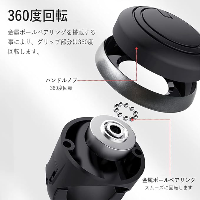 【360度回転】金属ボールベアリングを搭載する事により、グリップ部分は360度回転します。また、ハンドルスピンナーは回転半径を小さくすることを通じて、少ない力でハンドルを操作しできます。