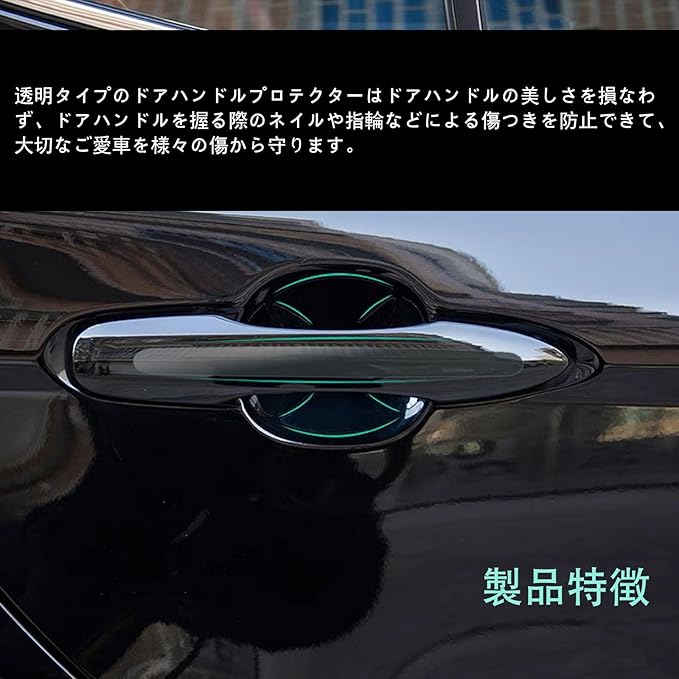 透明タイプのドアハンドルプロテクターはドアハンドルの美しさを損なわず、ドアハンドルを握る際のネイルや指輪などによる傷つきを防止できて、大切なご愛車を様々の傷から守ります。