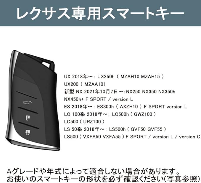 【レクサス適応車種】レクサス UX 2018年~: UX250h ( MZAH10 MZAH15 )/ UX200 ( MZAA10) 、 新型 NX 2021年10月7日~:NX250 NX350 NX350h NX450h+ F SPORT / version L 、 ES 2018年~: ES300h ( AXZH10 ) F SPORT / version L 、 LC 100系 2018年~: LC500h ( GWZ100 )/ LC500 ( URZ100 ) , LS 50系 2018年~: LS500h ( GVF50 GVF55 )/ LS500 ( VXFA50 VXFA55 ) F SPORT / version L / version C等 ※年式により異なる場合がありますので、画像のキーの形状をご確認下さい。画像のキーの形であれば適合です。ご不安な場合は、お気軽にお問合せ下さい。