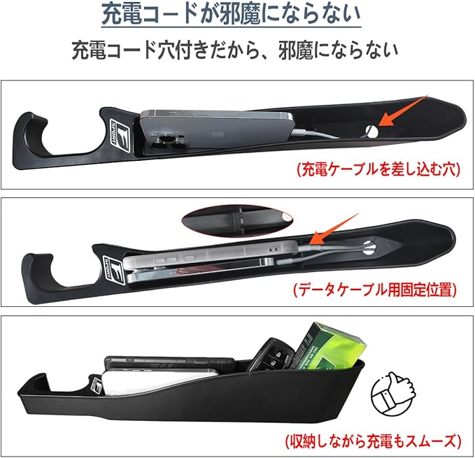 【充電対応の便利設計】 専用の充電穴で、収納したまま携帯電話を充電可能!電ケーブルが絡まる心配もなく、車内をスッキリ保ち、ドライブ中のストレスを軽減します。快適なカーライフを実現します。