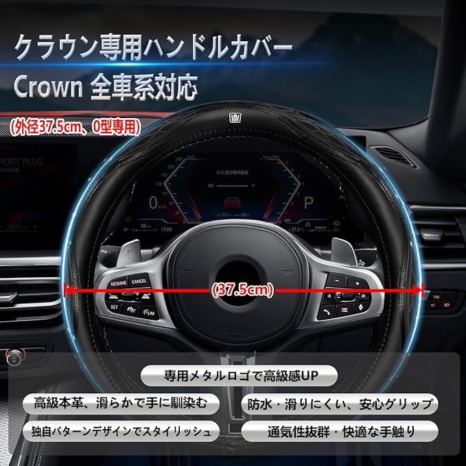 【高級本革 独自パターン】クラウン 専用 ハンドルカバー Crown ステアリングカバー 車種別ロゴ入り 防水 防滑 防汚 通気性 快適な手触り オールシーズン対応 簡単取り付け 高級インテリアパーツ 37.5cm(ブラック)