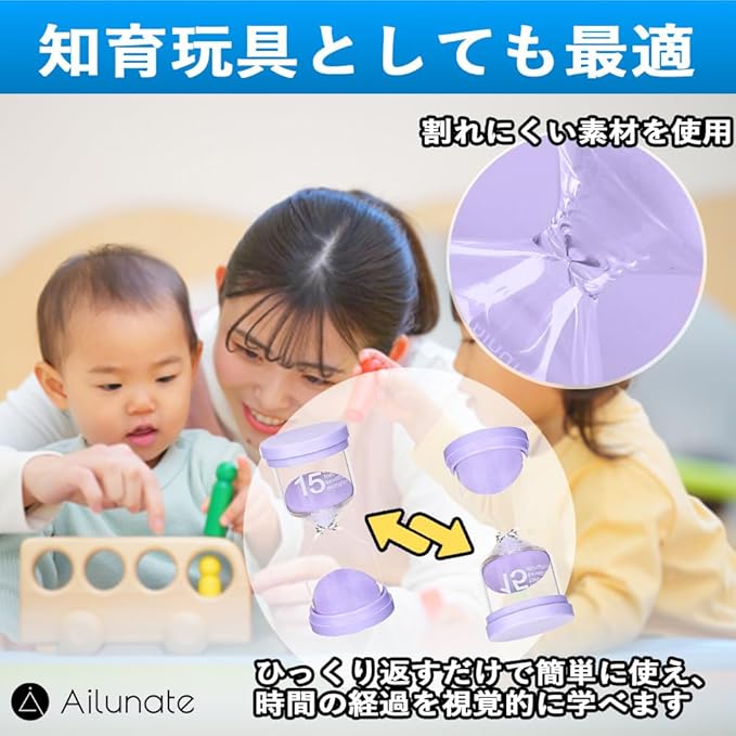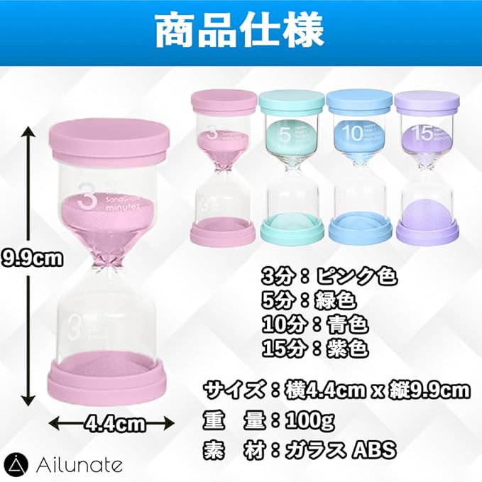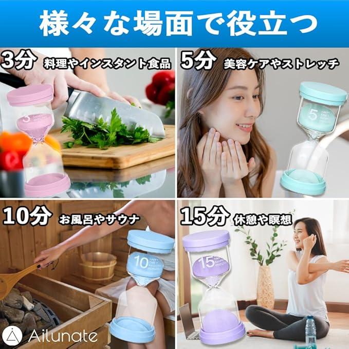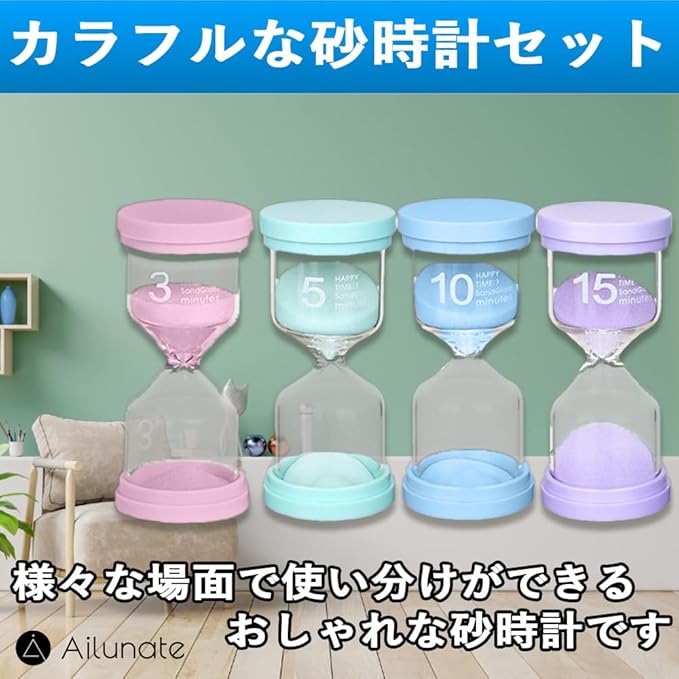 Ailunate 砂時計 4個 セット 3分 5分 10分 15分 サンドタイマー 子供 勉強 防水 おしゃれ ギフト プレゼント キッチン インテリア サウナ 知育