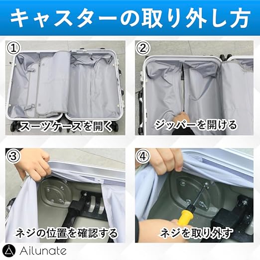 【キャスターの取り外し方】①スーツケースを開きます。②スーツケース内部のジッパーを開けます。③ネジの位置を確認します。④ドライバーでネジを緩め、キャスターを取り外します。