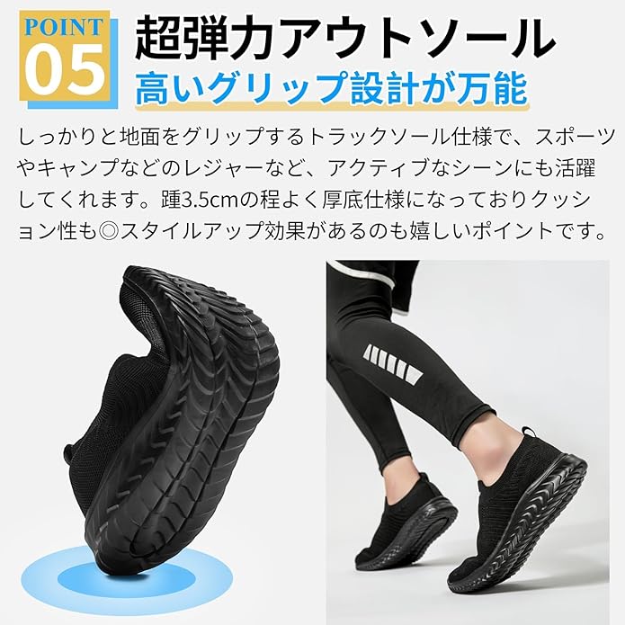 【超弾力アウトソール】屈曲性が高く、歩きやすさを重視した軽量ソールは、長時間の歩行でも苦になりません。しっかりと地面をグリップするトラックソール仕様で、スポーツやキャンプなどのレジャーなど、アクティブなシーンにも活躍してくれます。踵3.5cmの程よく厚底仕様になっておりクッション性も◎スタイルアップ効果があるのも嬉しいポイントです。