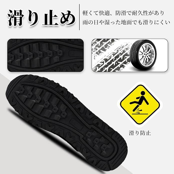 【滑り止め】ゴムソールは優れた滑り止め性能を持ち、その特有の素材は摩擦力を高め、滑倒のリスクを効果的に減少させます。ゴムソールは耐摩耗性も兼ね備えており、歩行時の安定性を確保します。したがって、雨の日や複雑な路面でも、安全性と足元の安定を確保します。