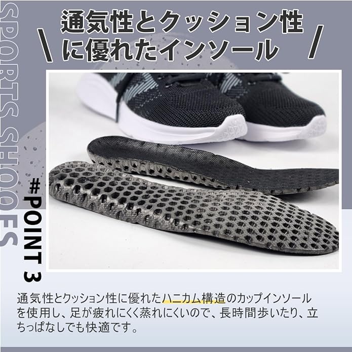 【踏み心地バツグン】蜂の巣のようなハニカム構造のインソールが、歩くたびにふんわりクッション。立ち仕事が多い方にも、足裏の疲れが軽減されると好評です。