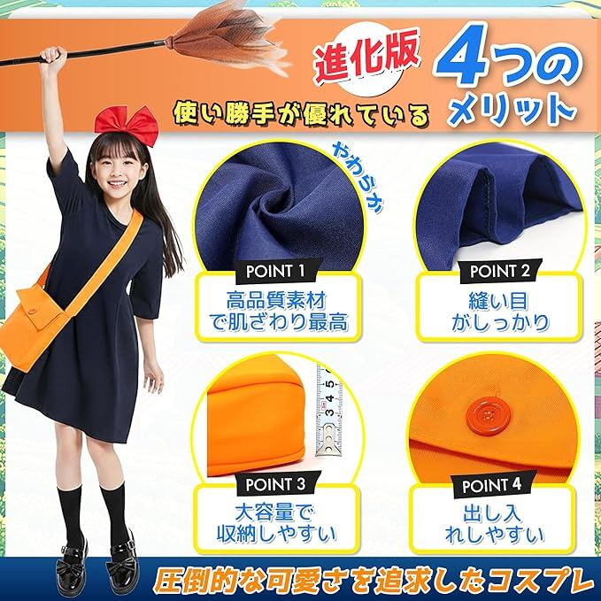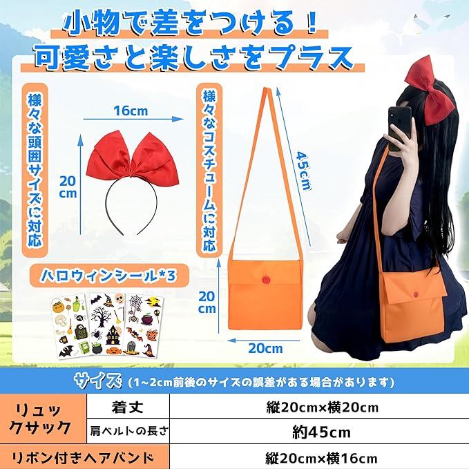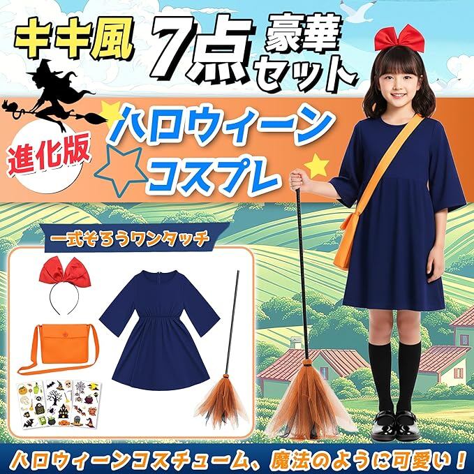 [COZENRE] 魔女キキ コスプレ 子供 ハロウィン 仮装【リボンカチューシャ+ワンピース+バッグ+ほうき+ハロウィンシール*3】7点セット 衣装 cosplay コスチューム レディース 子供コスプレ 女の子 萌え 可愛い 魔女の宅配屋さん 舞台演出服 文化祭 学園祭 子供用