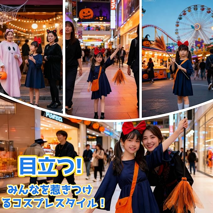 【こだわりのアクセサリーで完成度アップ】大きなリボンが可愛いカチューシャは子供の頭囲にしっかりフィット。魔法のほうきは長さ調節可能で、小さなお子様も安全に持てます。バッグのストラップで、肩かけや斜めがけができます。これらの小物が女の子の魔女コスプレをよりリアルに演出し、ハロウィン仮装や子供向けコスプレイベントで大活躍します。