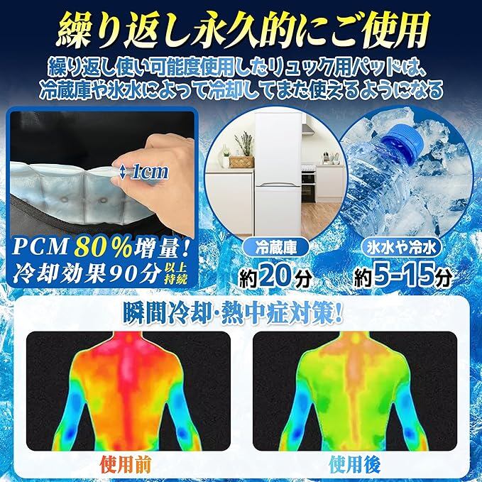 繰り返し使用可能:リュック 背中 冷却パッドはリュックサックを背負っても背中がひんやりします。リュック 冷却パッド、リュックサックの蒸れや暑さ対策に最適です。取り付けるだけで背中を快適にしてくれます。液体になった場合は、冷蔵庫や冷凍庫、氷水などで自然に28度以下で凍結し、何度でも使えます。