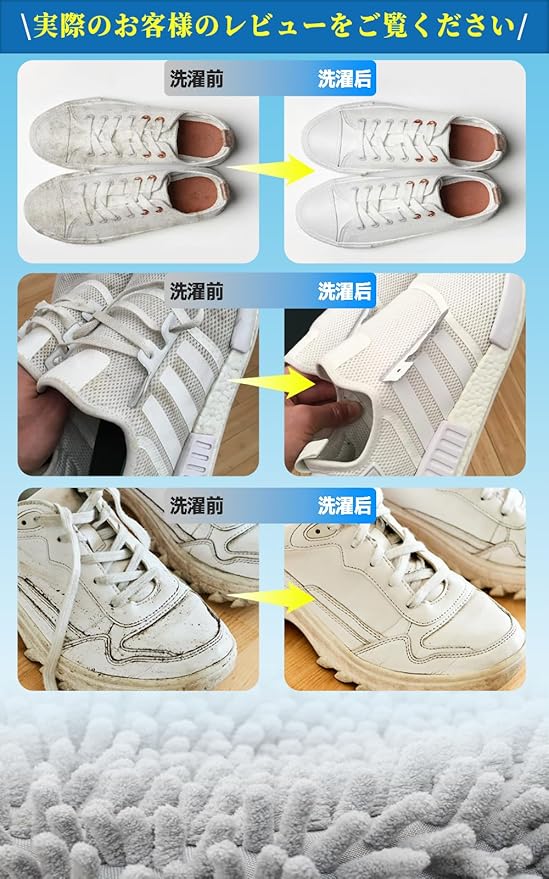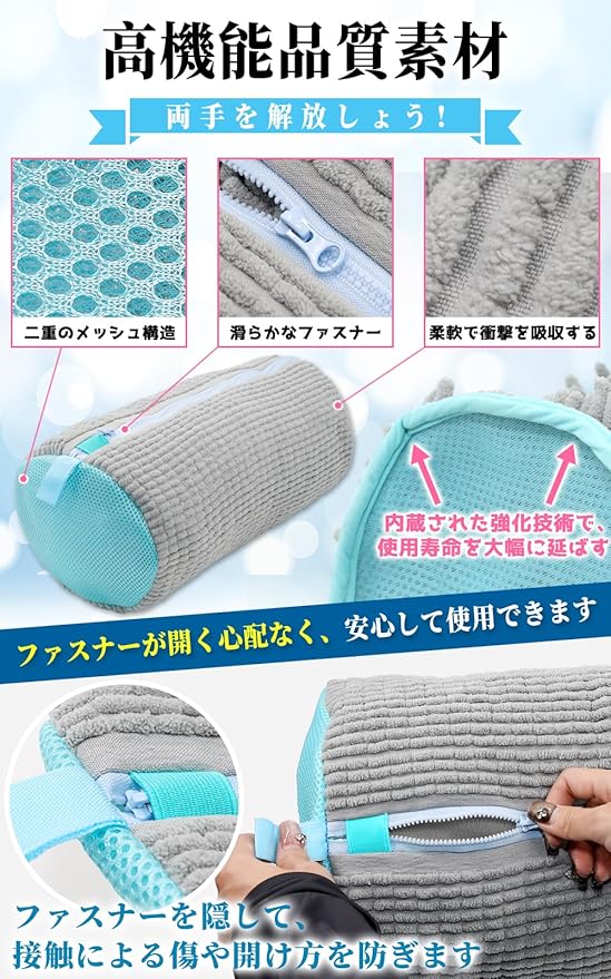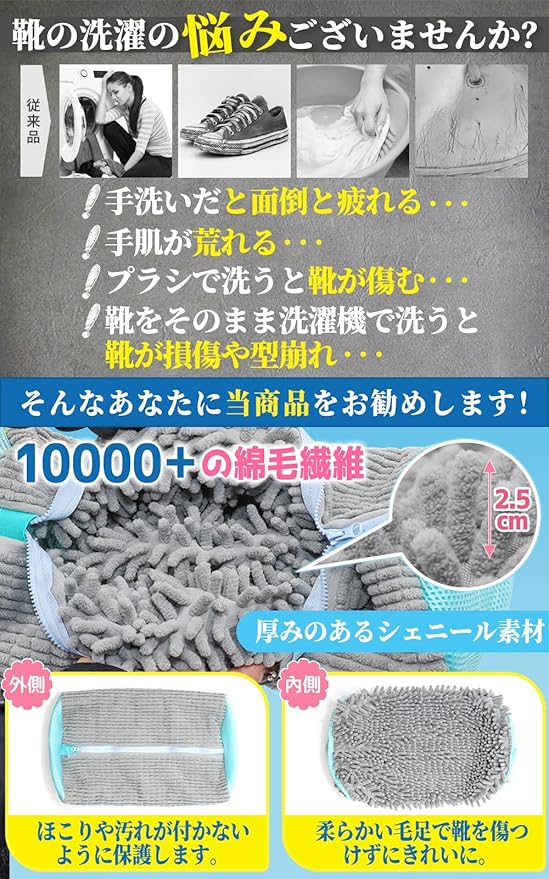 【高機能品質素材】の靴用洗濯ネットは、10000本以上の綿毛繊維を使用して、靴の汚れをしっかりと落とし、より清潔に洗浄できます。外側は柔らかい起毛素材でできており、ほこりや汚れを防ぎ、洗濯機の損傷から保護します。内側は柔らかいブラシ毛を使用し、厚手のシェニール素材で作られているため、靴を傷つけずにきれいに洗浄できます。二重のメッシュ構造と滑らかなファスナーで構成されており、柔軟性に優れ、靴への衝撃を吸収します。内蔵された強化技術により、使用寿命を大幅に延ばし、ファスナーを隠して接触による傷や開け方を防ぎます。旅行中,家の中ですの靴洗浄にも最適です。