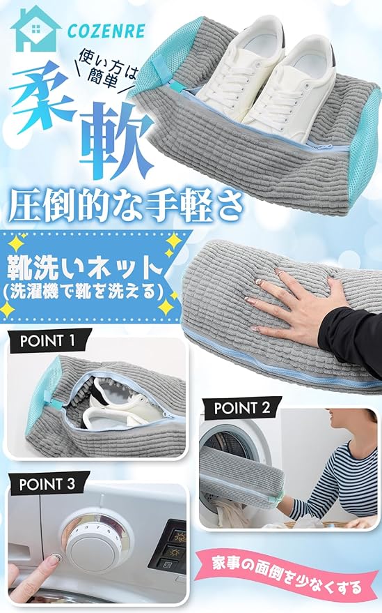 【圧倒的な手軽さ】使用方法は簡単です。靴を洗濯ネットに入れ、ファスナーを閉じて、洗濯機に洗剤と一緒に入れるだけで洗浄が始まります。洗濯ネットには小さなフックが付いており、使用後は掛けて干すことができ、次回の使用時にも便利です。洗濯ネットを使って洗濯機で靴を洗うことで、靴の表面をよりきれいにし、家事の手間を減らすことができます。
