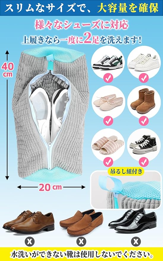 【スリムなサイズで、大容量を確保】靴用洗濯ネットのサイズは長さ40cm、直径20cmで、あらゆる靴のサイズに対応しています。子供靴から大人靴、お年寄りの靴まで、簡単にランドリーバッグに入れて洗うことができます。ランドリーバッグの内側は十分なスペースがあり、どんなサイズの靴でも収納できるため、靴が洗濯ネットに収まらない心配はありません。様々なシューズに対応上履きなら一度に2足を洗えます!水洗いができない靴は使用しないでください。