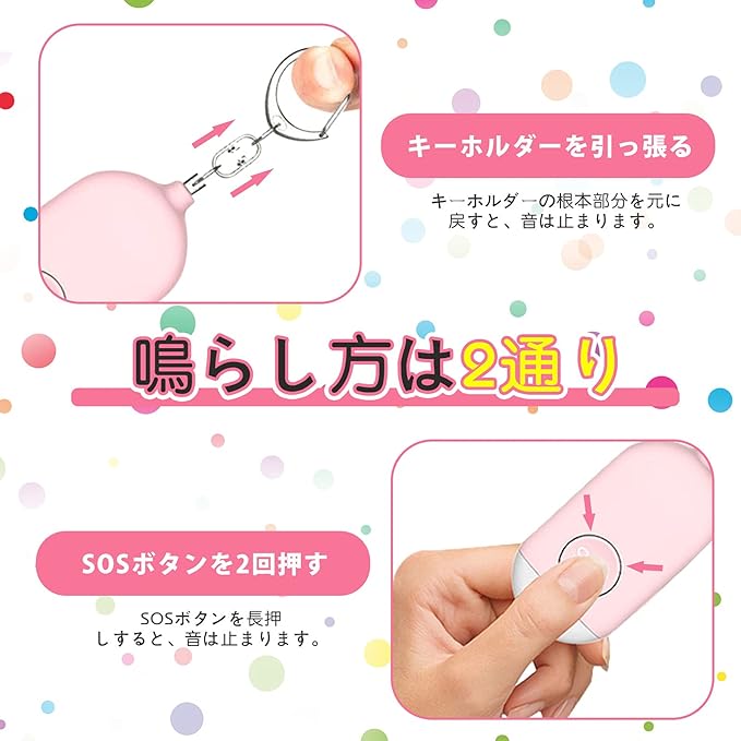 【簡単に操作できる二つの使い方】ブザーの鳴らし方(1):ピンを抜くと大音量のブザーが鳴ります。消したい時はピンを元に戻して下さい。ブザーの鳴らし方(2):SOSボタンを2回押すとブザーが鳴ります。消したい時はSOSボタンを長押しして下さい。
