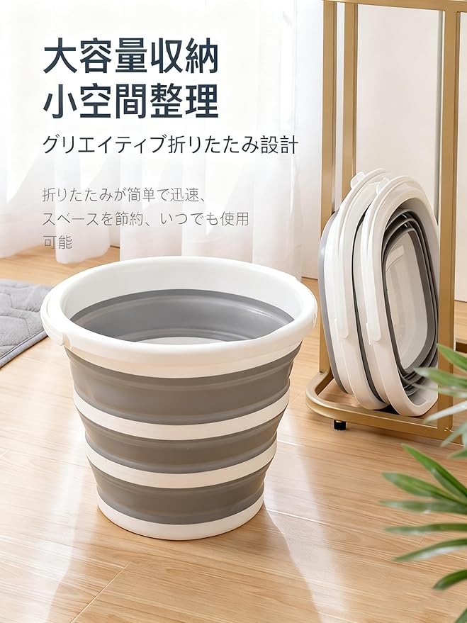 折りたたみバケツ 10L 大容量 厚手 丸型/四角型 多機能 洗濯 洗車 足湯 釣り コンパクト収納 PP+TPR素材 グレー/ホワイト (丸型)