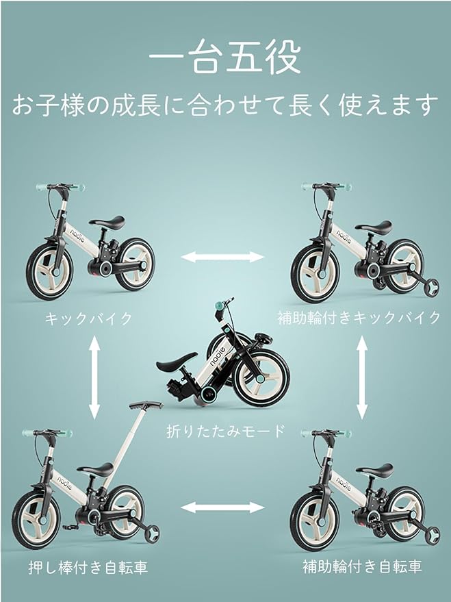 【一台五役】キックバイク、補助輪付きキックバイク、押し棒付き三輪車、自転車、補助輪付き自転車、4つの楽しみ方で、お子様の成長に合わせて変身できるので、長くご使用いただけます。