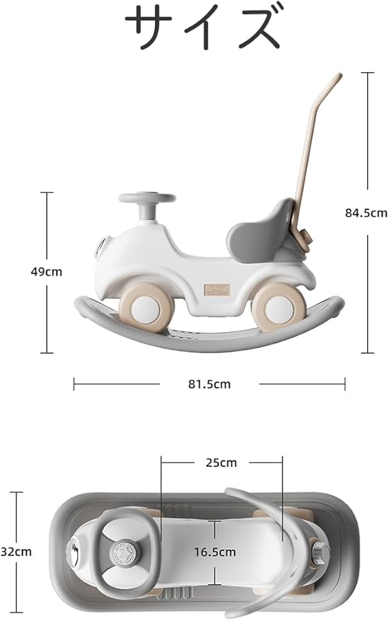 サイズ:81.5*32*84.5cm 重量:4.5kg 耐荷重:60KG 対象年齢:1歳~ ご注意:クラクションの付属パーツ(音楽ボックス)の曲は中国語のため、商品に入れないようになっています。代わりに、黒いカバーが付いています。ご了承ください。