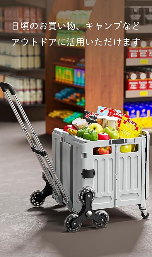 日頃のお買い物、キャップなどアウトドアに最適、階段も上がれるショッピングカートです。