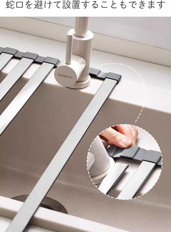 蛇口を避けて設置可能。ワイヤーは個別に取り外せるので、蛇口部分を避けて設置できます。シンクの幅に合わせて折ってもカットしても調節が可能です。