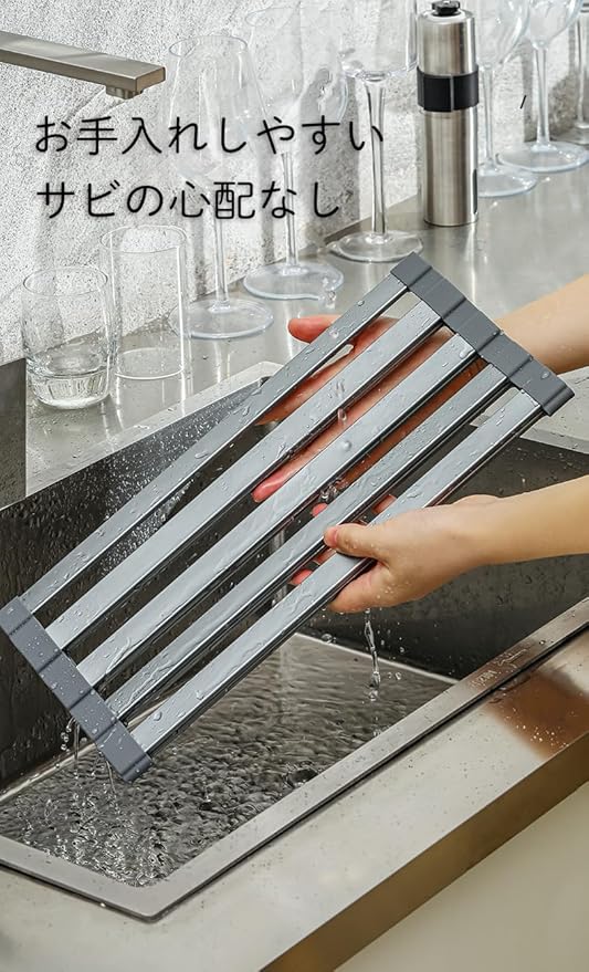 シンクの上に広げるだけでカンタンに設置できる水切りラック。両サイドのシリコンキャップがシンクにしっかりとくっつき、ズレ落ちの心配がありません。