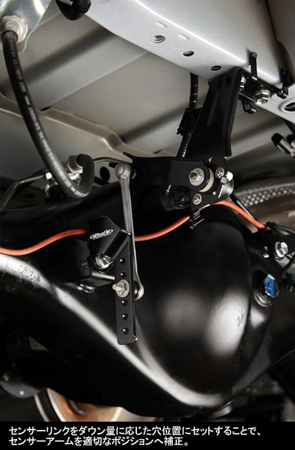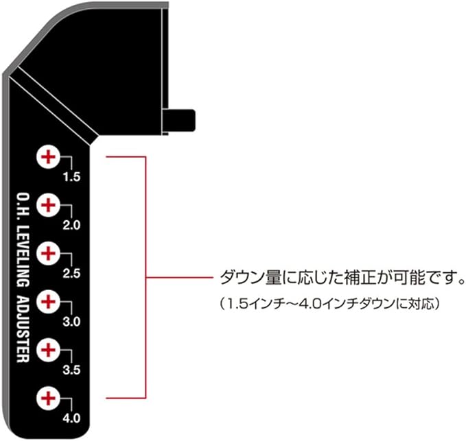 III型以降のモデルに純正オプション設定された、オートレベリング機能付ヘッドランプ。しかし、この便利な機能が原因で、ローダウンした場合にある問題が発生します。それは、後輪軸に設置されているハイトコントロールセンサーが車体後部の沈み込みを感知し、自動的に光軸を下向きにしてしまうのです。“O.H.レベリングアジャスター"は、センサーリンクをダウン量に応じて設けた穴に装着するだけで、下がった光軸を正常な高さへ補正します。1.5インチ(-37.5ミリ)~4.0インチ(-100.0ミリ)までのローダウンに対応するこのアイテムは、純正オプションヘッドランプ装着車にとってなくてはならない必需品といえるでしょう。