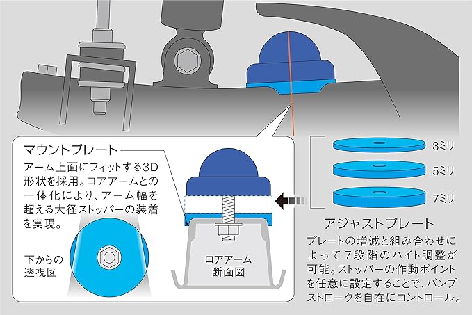 今日にいたるまでハイエースをハードダウンさせる際は、硬いバンプストッパーと分厚いスペーサーをセットで装着する必要がありました。バンプストロークするたびに起こるフロントタイヤとホイールハウスの干渉を防ぐには、乗り心地を犠牲にしてでもストロークを規制する以外に対応策がなかったのです。そこで、内側と外側で異なる硬度に成型する新技術「2層構造」に着目。構成比率と硬度をハードダウンユーザー向けに最適化することにより、革新的アイテム“バンプストッパーPRO"を完成させました。バンプショック軽減とストローク制御という物理的に相反する課題を克服した結果、快適なハードダウンを現実のものとしたのです。また、新開発「マウントプレート」によってアーム上面幅を超えるストッパーの大型化を実現。従来品では補えなかった耐久性も兼ね備えました。オプション設定された“アジャストプレート"を組み合わせて使用すれば、ストッパーの作動ポイントを自在にコントロールできます。