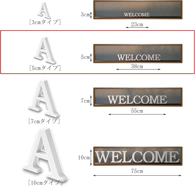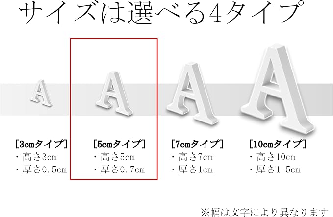 高さ5cmタイプ。単文字:2個入り。セット品:各1個入り(A~Z、0~9、&)計37個入り。