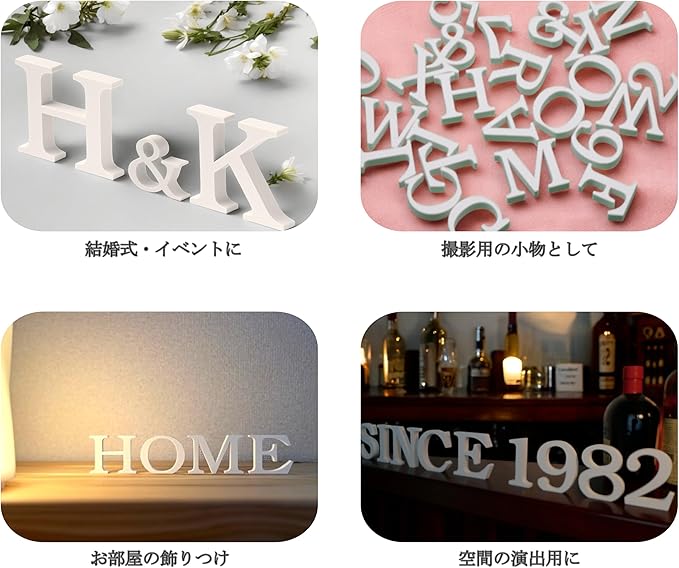 清潔感と上品さが特徴のホワイトカラーは、結婚式や新生活、日常のインテリアに最適。必要な文字を自由に組み合わせ、統一感のある空間演出を楽しめます。テーブルや棚に飾りやすいサイズ感で、特別な場面を美しく彩ります。[お願い]製品には、ごく稀に小さな黒点が見られることがあります。これは材料由来のものであり、商品の特性としてご了承ください。