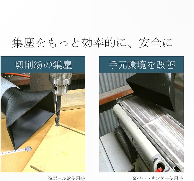 「あなたの作業場が、もっとクリーンになる。」 作業環境の粉塵対策は、効率と安全のために不可欠です。Profitシリーズのダストフードは、ダクトホースの先端に取り付けるだけで、手元集塵の可能性を広げます。 この製品が持つ独自の形状と、Profitシリーズ共通の頑丈な作りが、DIYユーザーから各種施設・作業所まで、あらゆる環境で快適な作業空間を実現します。木くずや切削粉といった飛散物を効果的に捕集し、クリーンな作業環境を維持。作業効率の向上に貢献します。 利用例 電動工具(ベルトサンダー、トリマーテーブル)を利用する際の手元集塵 ご注意 ※本製品は、ダクトホースの接続・固定を目的として設計されています。集塵システムへの組み込みを推奨していますが、ご使用の際は対象物の性質を十分に考慮し、安全な設計の下でご自身の責任においてご使用ください。
