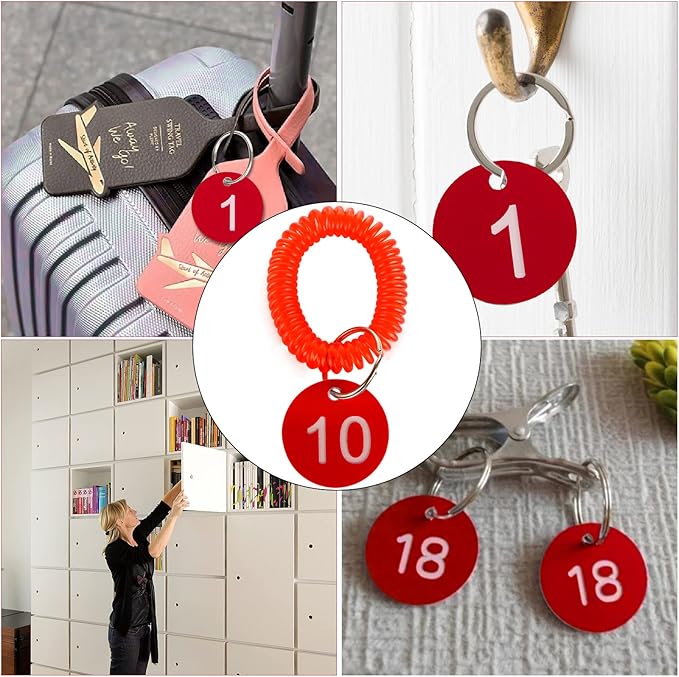 RILIHII【50個/セット】番号札 ドア番号タグ クローク ロッカー 番号札 赤い 番号ナンバー1から50まで 直径35mm キーラベルタグ キーホルダ ラウンド 防水 耐高温 耐久性 色褪せない 軽量 多用途(リストコイルキーチェーン赤色50本とキーリング50枚付き)