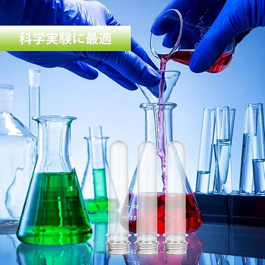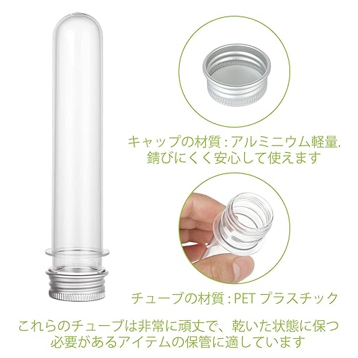 【商品内容】試験管:20本入;サイズ:直径25mm、高さ140mm、容量40ml;材質:ボトル / PET製、フタ/ アルミ製 。