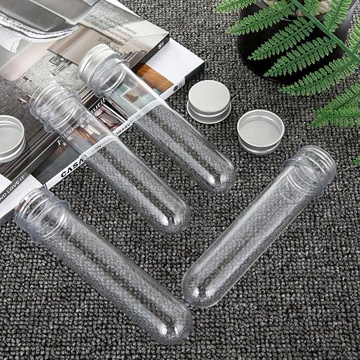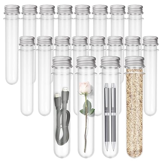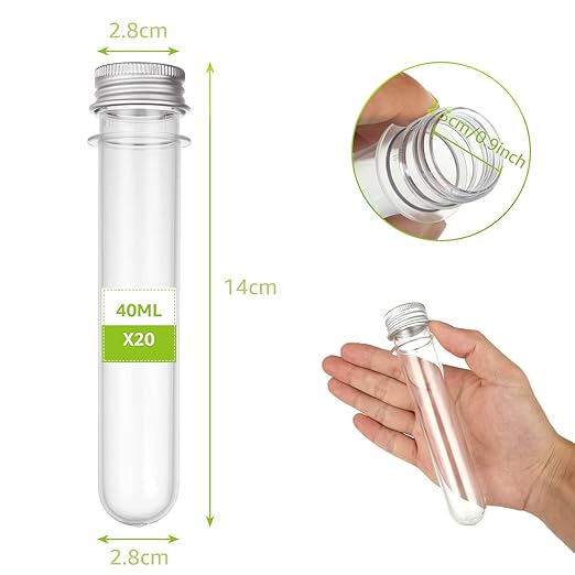 RILIHII 【20本セット 】試験管40ML アルミキャップ付き 透明アルミ蓋付き プラスチック試験管 140x25MM て サンプル保存 多用途透明で中身をはっきり見えます。ビーズの収納、実験や研究、検査用、水耕栽培、一輪挿し,サンプルの保存、小物入れ等、幅広い用途にお使い頂けます。軽量で持ち運びにも便利です。ガラス製と違って丈夫で割れにくいため、安心してご使用いただけます。実験室、工芸プロジェクト、学校などにどうぞ!お子様の自由研究などのお供に、また、サンプルの保存(ビーズ、御香、砂等)などにも使用できます。仕様: