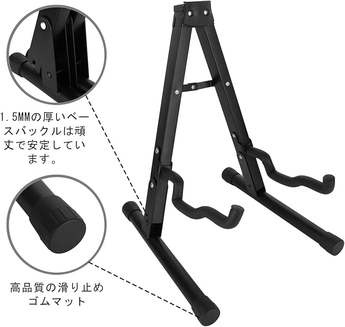 【優れた安定性】:このギタースタンドは三角支持タイプを採用し、物理的で揺れにくく、安定性に優れています。また、底面には滑り止めが付いており、滑りにくくなっています。頑丈な二本足構造で、揺れを防ぎ、楽器を保護します。