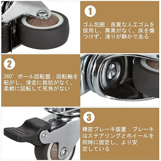 360度回転:キャスターはスムーズに360度回転できます。輸送工具の車輪としてとても便利です。重いものを楽に移動することができます。