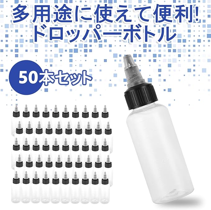 パッケージ内容:50スポイトボトルのセット、サイズ:高さ:11.4センチメートル、底部の直径:3.36センチメートル、容量:50ミリリットル。