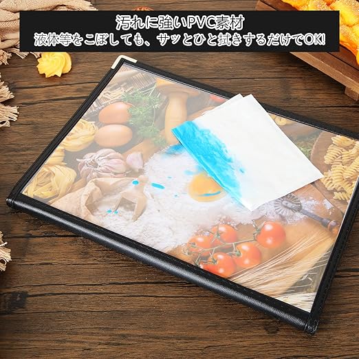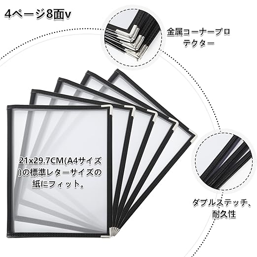 RILIHII メニューブック【5冊セット】メニュー表 A4 (4枚8面) 透明 料理写真入り 保護 汚れ防止 内ページサイズ21x29.7CMメニューが一目でわかります、透明な材質であるため、ブックを閉じていても中のメニューが見えるデザインになっています。いちいち開かなくてもメニュー内容が視界に入ってくるので、お客さんがスムーズに注文しやすくなります。A4サイズの紙であれば、飲食店のメニュー以外にもご使用いただけます。例えば、サービスの受付窓口で事務手続きの説明をするための書類などです。商品仕様
